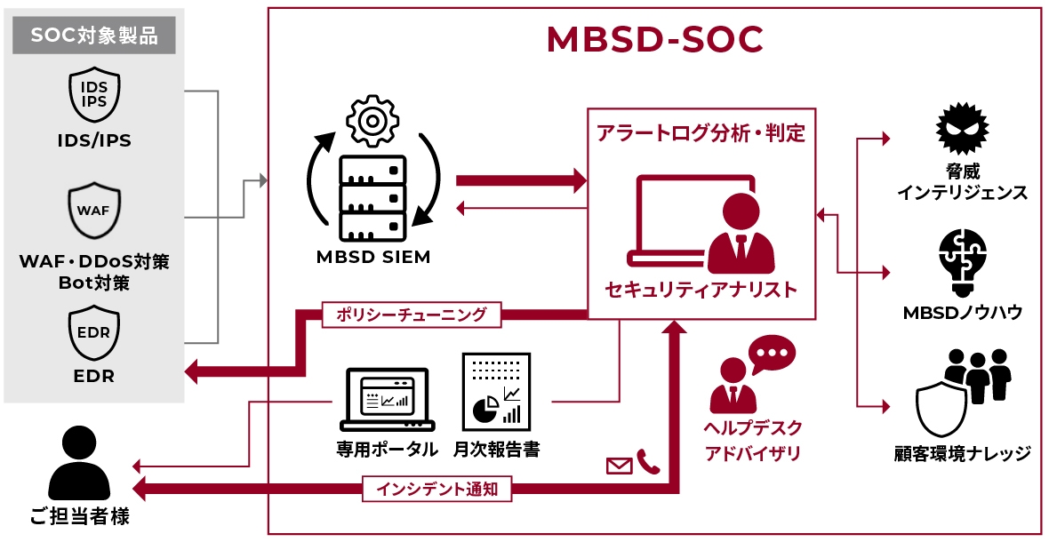 MBSD-SOCでは、主要なセキュリティベンダーのWAF、IPS、EDR、SASEなど幅広い機能を対象にSOCを提供しています。
