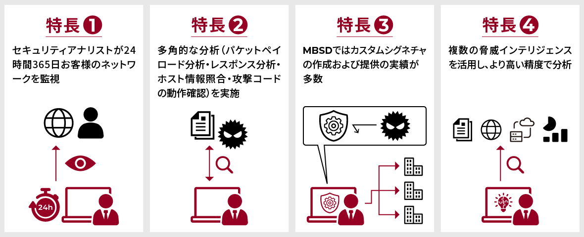 20年を超える豊富な経験・実績・知識・脅威情報を活用しMBSD-SOCのセキュリティアナリストがお客様のオンプレミス・クラウド上に設置されているセキュリティ製品を24時間365日体制で日々進化するサイバー攻撃からお客様の環境を守リ続けます。